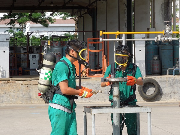 本次演練項(xiàng)目為:LPG1#儲罐底部出口閥被恐怖分子破壞造成液化石油氣泄漏事故的應(yīng)急處置。主要流程為:模擬事故發(fā)生、制服歹徒、報(bào)警、應(yīng)急啟動(dòng)、人員疏散、安全警戒、消防噴淋驅(qū)散稀釋燃?xì)鉂舛?、搶險(xiǎn)堵漏及最終解除警戒等。在總指揮的領(lǐng)導(dǎo)下,所有參演人員嚴(yán)肅認(rèn)真、有條不紊地進(jìn)行各個(gè)演練步驟,歷時(shí)一個(gè)小時(shí)后,演練圓滿結(jié)束。