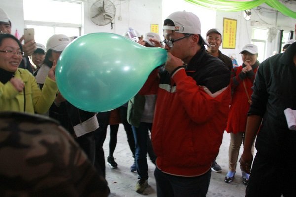 吃過午飯后,經(jīng)過一個(gè)小時(shí)的休息,拓展活動(dòng)繼續(xù)進(jìn)行。下午的第一個(gè)活動(dòng)為“牛皮吹破天”,要求各小組將所發(fā)全部氣球吹爆,總計(jì)時(shí)間最短的小組獲勝。裁判根據(jù)氣球頭數(shù)量核實(shí)戰(zhàn)績。游戲開始時(shí),各小組的男士們紛紛發(fā)揮紳士風(fēng)度,爭分奪秒,氣球爆炸聲此起彼伏,為了加強(qiáng)娛樂性,裁判組分別給每個(gè)小組分發(fā)一個(gè)大氣球,每次大氣球的吹爆過程都能引來隊(duì)員們的側(cè)目相看,隊(duì)員們臉上露出各異的表情,或驚奇,或興奮,或賊笑……